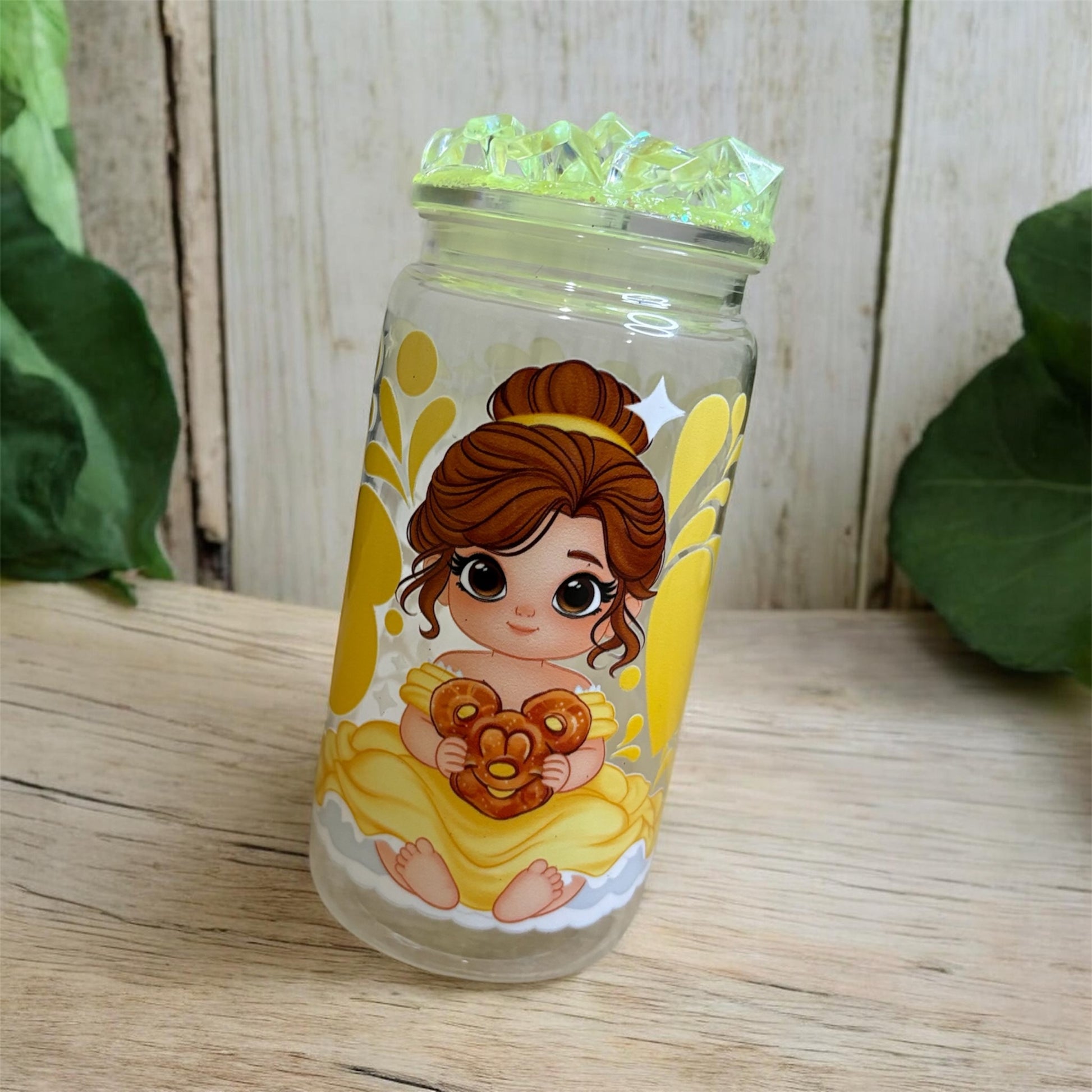 Hermoso vaso de acrílico resistente inspirado en La Bella y la Bestia, diseñado para quienes aman los detalles elegantes y mágicos. Incluye tapa personalizada decorada con cristales y glitter amarillo, inspirada en el icónico vestido de Bella, que aporta brillo y un toque único.
